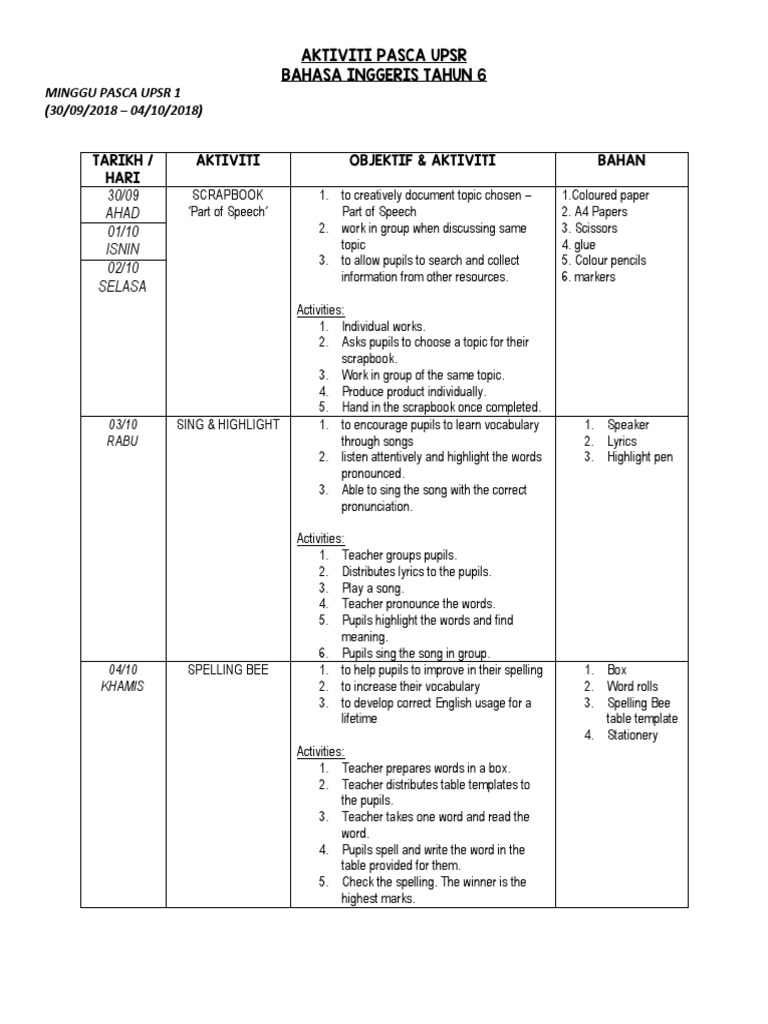 Jadual Dan Aktiviti Pasca Upsr 2018 Pdf English Language Vocabulary
