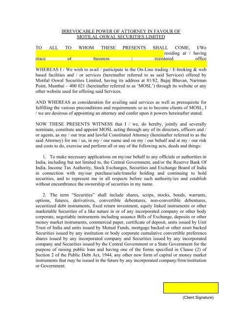 Irrevocable Power Of Attorney Motilal Oswal