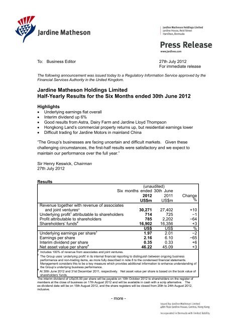 Jardine Matheson Holdings Limited Half Yearly Results For The Six